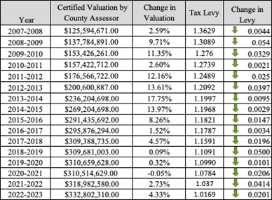 Like many of you I received my tax statement for 2022 in the mail this week and wow. Just wow. Even though as a school we have lowered our levy each year for the past 16 years in a row, we have not been able to lower it enough to keep pace with assessed values. My home went up $62,000 in assessed valuation in one year which would have required a massive drop in all levies. The school sets its budget off expected needs for the year and like all of us with inflation, prices have risen, salaries, insurance, retirement and just everything has risen and yet we were still able to lower our overall levy by 2 cents. The school has no control over assessed valuations as they are set by our county assessor and really all they are doing is looking at recent sales of similar property located near your property to set those values.