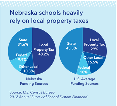 The Nebraska Legislative Fiscal Office has projected that valuations will continue to rise 5.58% in 2023 and 7.5% in 2024. In November of 2022, farm ground in Sheldon and Boyden County of Iowa sold for $30,000 per acre and a month before a farm ground in Plymouth County Iowa sold for $26,000 an acre. Guess what the properties around those sold will be valued at, next time valuations are set? I recently attended a meeting hosted by Open Sky institute, which is a non-partisan organization that advocates for a strong Nebraska through clear fiscal research and analysis. A couple of things that resonated with me from that meeting. Nebraska ranks 49th in Nation for funding to public schools, which means that schools rely heavily on local property taxes. Most States, like Nebraska rely on a 3-legged stool of taxation from sales taxes, income taxes, and property taxes. But in Nebraska, the 3 legs are completely out of balance with property taxes making up close to 50%. The illustration below comparing Nebraska to other States is from 2012 and it has only gotten worse.